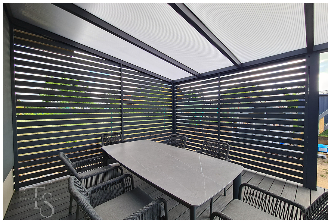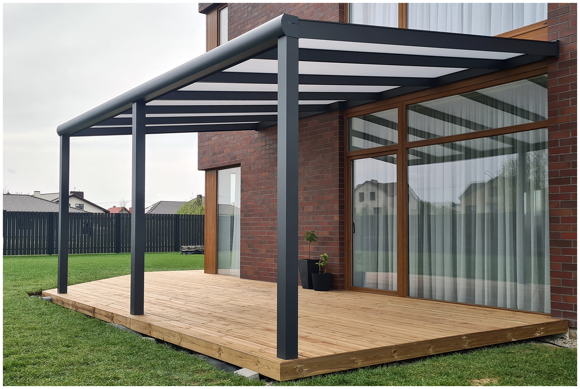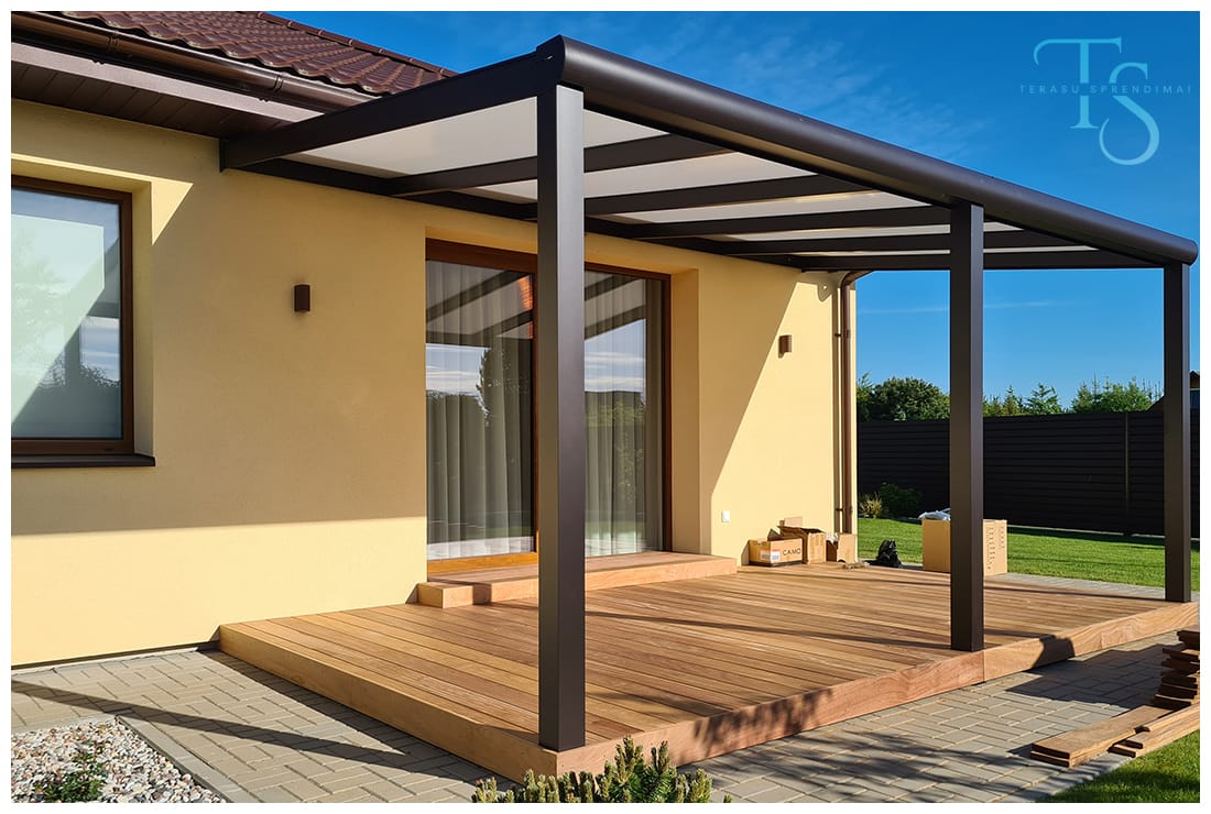 Aliuminio stoginės su polikarbonato stogo danga ir integruotu lietaus nuvedimu